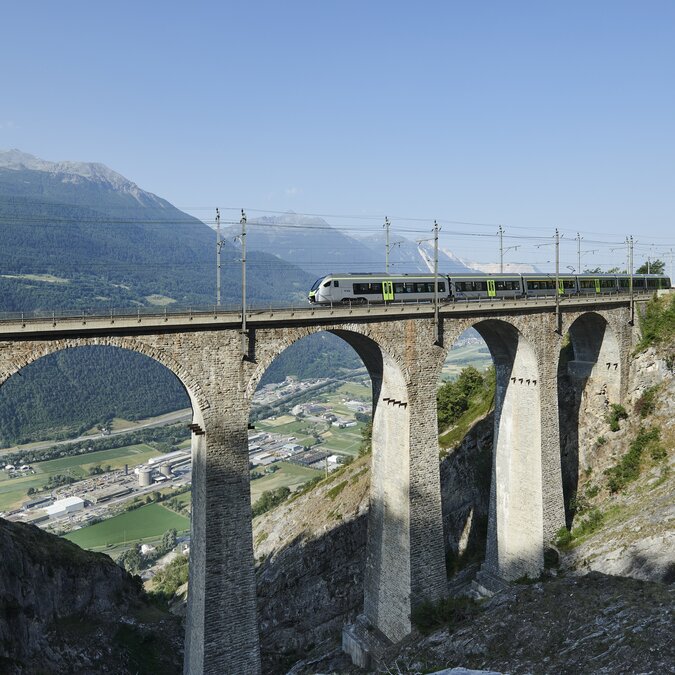 The historic mountain line is one of the most important structures in Swiss railroad history and impresses with the imposing Kander Viaduct and the hairpin bends around the Felsenburg.