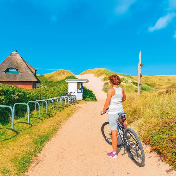 200 km de pistes cyclables et un grand choix de circuits à vélo: faire du vélo à Sylt est un vrai plaisir! Découvrez cette île aux multiples facettes au cours d'un circuit de près de 30 km à travers les landes et les dunes: de Westerland, la capitale miniature très animée, à Keitum, un village au charme chic et authentique, en passant par Kampen, où luxe et nature s'harmonisent parfaitement. Vous faites une pause à Kampen. À l'ouest, vous profitez de la vue unique de la falaise rouge sur l'immense plage, et à l'est, le célèbre café Kupferkanne vous attend avec ses gourmandises. À Keitum, la maison frisonne, un musée, vous donnera un aperçu de la vie sur l'île au 18e siècle. Ce circuit est à l'image de l'île: une dose généreuse de nature avec une pincée de chic, de culture et de gastronomie.