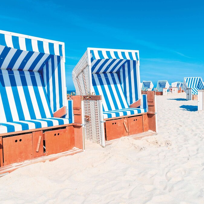 On ne pourrait plus imaginer Sylt sans ses chaises de plage. On en compterait près de 12 000 aujourd'hui. À la fin du 19e siècle, elles se sont rapidement répandues sur les plages allemandes de la mer Baltique et de la mer du Nord. Conçus comme des meubles de plage à une, deux ou trois places, au design typiquement rayé bleu et blanc, ils sont équipés de tout le confort nécessaire: coussins moelleux, accoudoirs, marquise rabattable, repose-pieds extensibles, table pliante, porte-verre, poches latérales, espace de rangement... pour bronzer en position assise ou allongée, à l'abri du vent, du vol du sable et des regards indiscrets. Les chaises de plage de Sylt sont à l'image de l'île - d'un chic irrésistible!