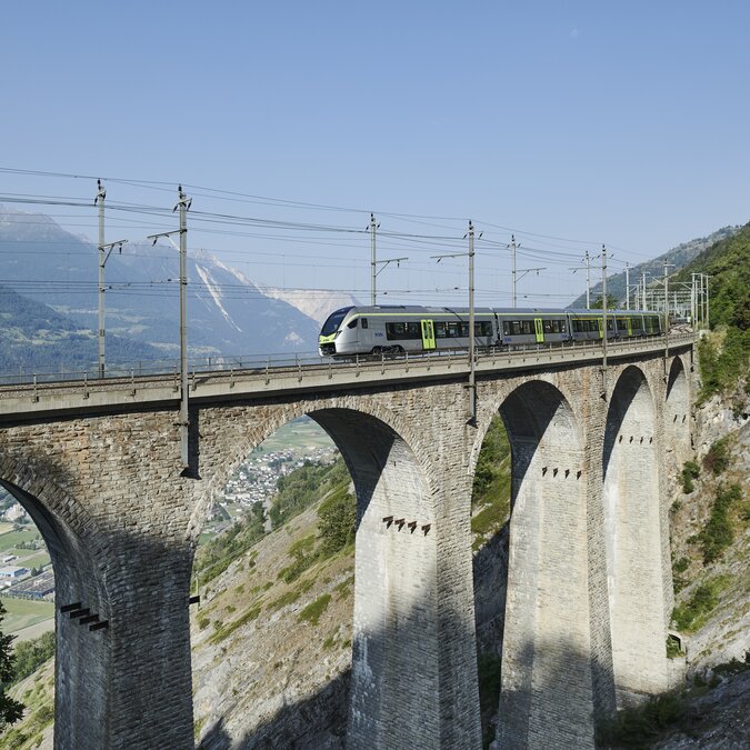 La ligne de montagne du Lötschberg fait partie des ouvrages les plus importants de l'histoire des chemins de fer suisses. Elle impressionne par son imposant viaduc sur la Kander et ses boucles de retournement autour du Felsenburg.