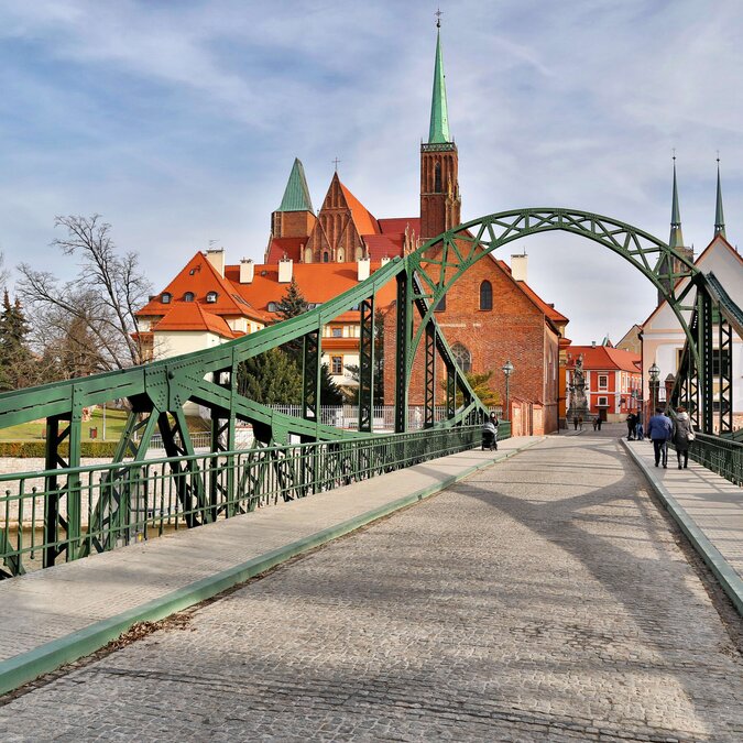 Wroclaw occupe un site enchanteur sur les rives de l'Oder. Traversée par de nombreux affluents, la ville consiste en 12 îles reliées par plus de 100 ponts. Le pont suspendu Grunwaldzki, long de 116 m, est l’un des symboles de la ville.